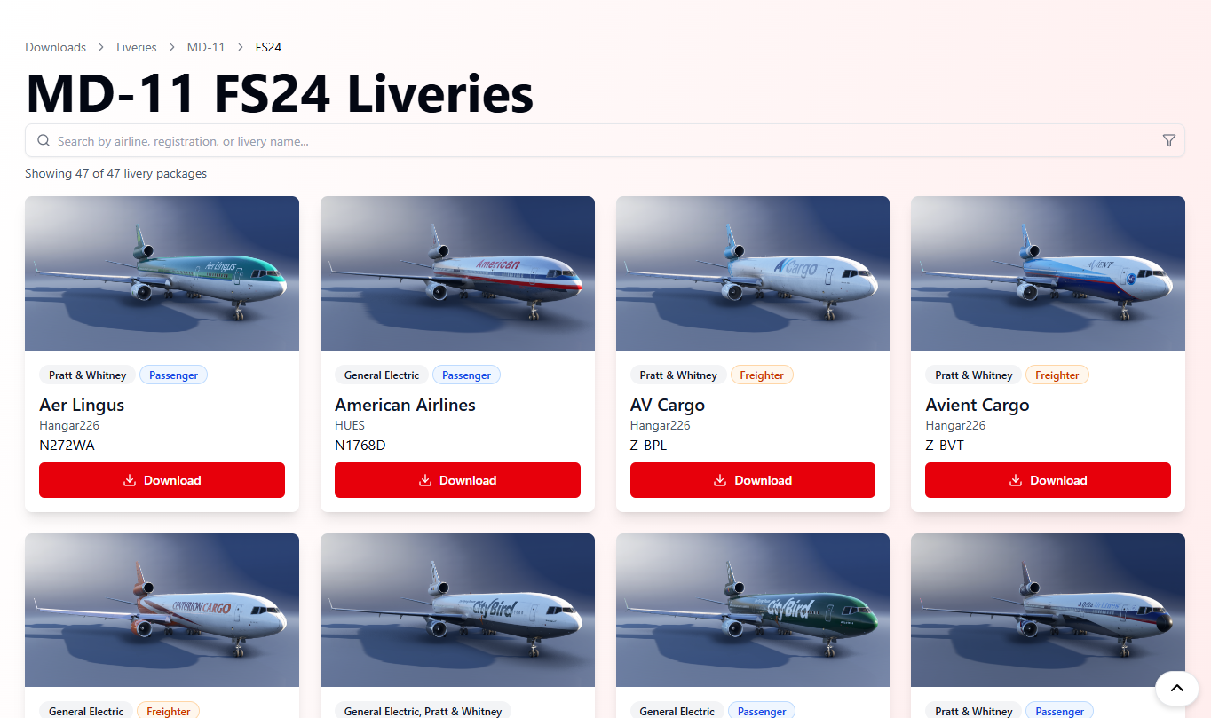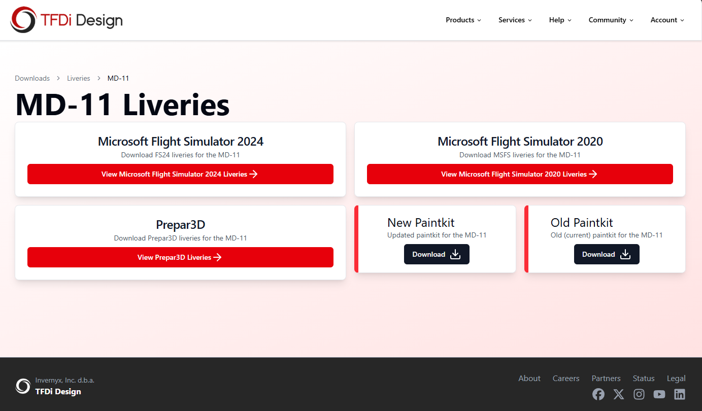 1) Go to https://tfdidesign.com/downloads/liveries/md11 and choose Flight Simulator 2020 or Flight Simulator 2024: